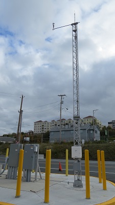 Deployed in November 2014, the Meteorological Station is located at Pier 9C of the Halifax Ocean Terminals. The station consists of an RM Young Model 85004 anemometer, mounted on a three-meter boom arm approximately 10 meters above ground level, affixed to a light standard at the end of the pier.