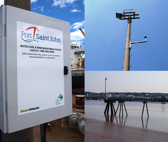 Near-real time access to physical environmental observations such as local wind and sea levels are some of the basic requirements of a modern 'Smart Port' operation. Along with accurate site forecasts, these observations are essential in promoting the operational efficiency, safety and situational awareness of vessel movements within a harbour and its approaches. In this context, Wood PLC, in partnership with the Marine Institute of Memorial University Center for Applied Ocean Technology, has developed this wind and water level monitoring station (tide gauge) to satisfying the Port of Saint John objectives for a water level and wind monitoring station for Courtenay Bay. The station is capable of measuring and reporting accurate data and is reported live via the SmartAtlantic ocean observation system website. This station consists of a Yaleport TideMaster water level recorder with Yaleport VRS20 radar (water) level sensor and a Gill WindSonic anemometer to measure wind speed and direction.